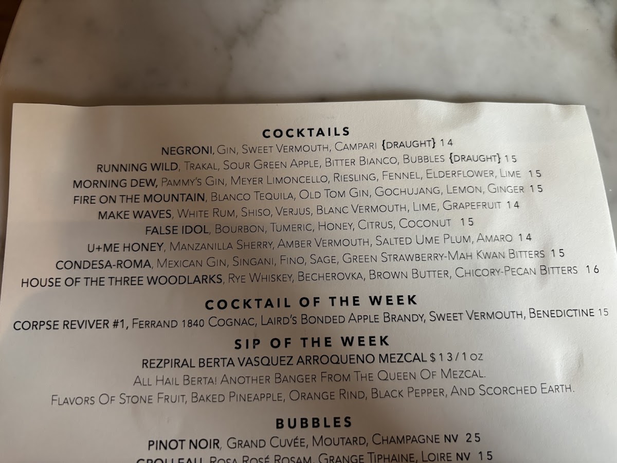 Be sure to save room for dessert, where the Cinnamon Roasted Apples with Gingersnap and Rum Ice Cream and the decadent Milk Chocolate Mousse with Torched Meringue and Chiles await to enchant your senses. Each dessert is artfully crafted, promising a sweet ending to your memorable meal.